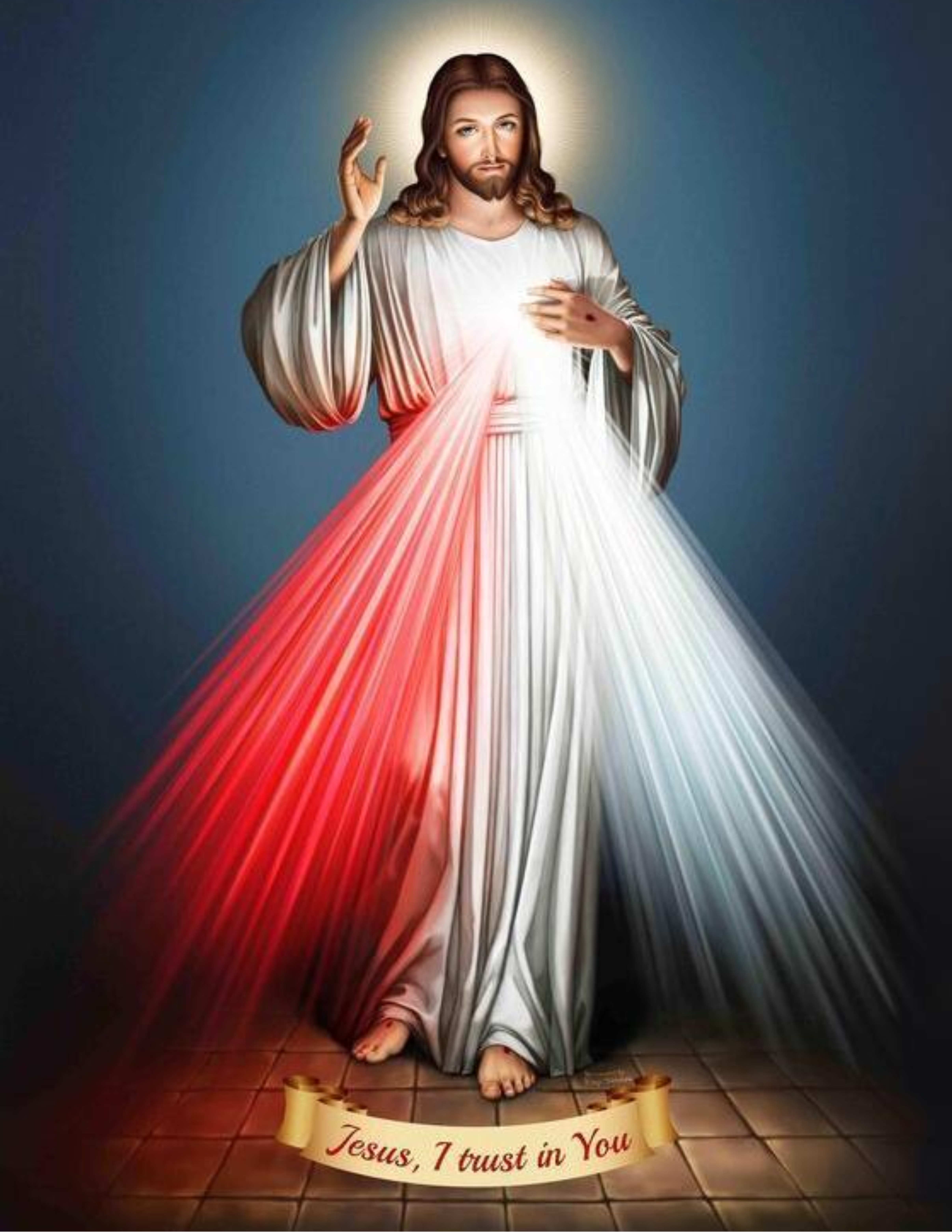 Jesus appeared to Saint Faustina in a vision, with His right hand raised in a blessing and His left touching His garment above his heart. Red and white rays emanate from His heart, symbolizing the blood and water that was poured out for our salvation and our sanctification. The Lord requested that “Jesus, I trust in You” be inscribed under His image.